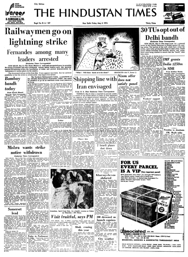 | HT THIS DAY: May 03, 1974 Railway men go on lightning strike (Click to expand) The Home Ministry's swift and unexpected move in arresting Mr George Fernandes and other prominent railway labour leaders early this morning sparked off lightning strikes, the cancellation of trains and protest demonstrations by railwaymen at various places in the country. Read more. |