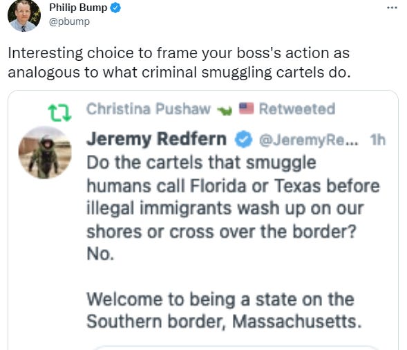 You can tell because of the reaction on the right: a cascade of LOLS and triggering-the-libs-huzzahs as Greg Abbott and Ron DeSantis stick it to the hypocritical Blue State elites. Donald Trump may have come down a golden escalator to denounce Mexican rapists, but these guys are actually putting them on busses and sending them to Chicago.