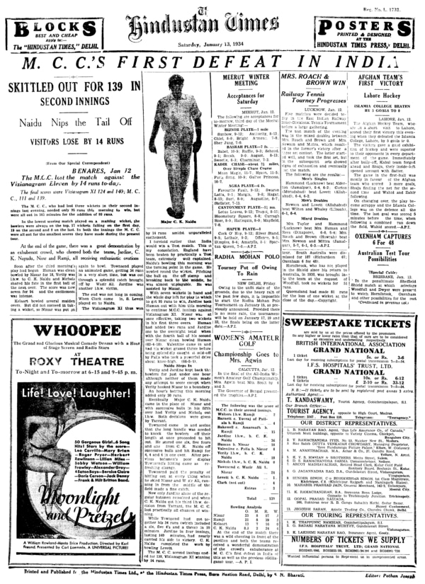 HT This Day: January 13, 1934 M.C.C.’s first defeat in India The M. C. C., who had lost three wickets in their second innings last evening, needed only 95 runs this morning to win, but were all out in 105 minutes for the addition of 80 runs. Read more. |