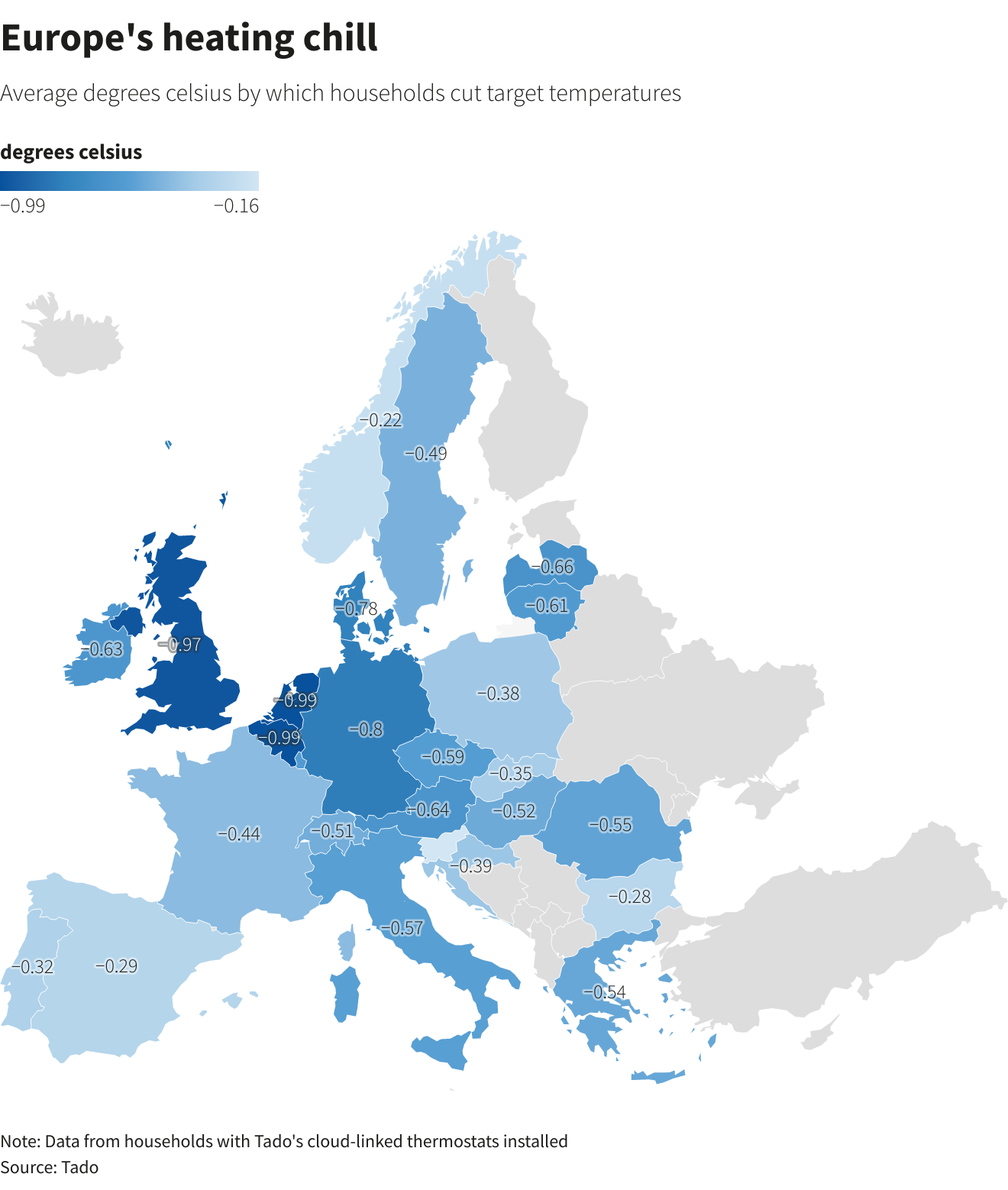Data from hundreds of thousands of smart thermometers installed in households across Europe by Munich-based company Tado, shows that as temperatures dropped, households responded to dire warnings about higher heating costs. |