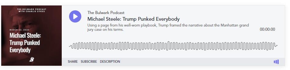 Kelly has been vocally critical of Hagedorn, has apologized for supporting him, and made it clear that he would show no similar flashes of judicial independence. ** Which brings us back to Hamilton. In Federalist 78, Hamilton warned that the judiciary has “neither FORCE nor WILL, but merely judgment,” and that ―”[t]o avoid an arbitrary discretion in the courts, it is indispensable that they should be bound down by strict rules and precedents, which serve to define and point out their duty in every particular case that comes before them.” This, argued Hamilton, is why judicial independence was so important. It was one of the “bulwarks of a limited Constitution against legislative encroachments.” But judicial independence is also essential for the legitimacy of the courts and the rule of law. If judges are merely partisan legislators then what, really, does the “rule of law” mean? If the law changes with every election, is it really the law, or simply politics by other means? Why should the courts and their rulings deserve any more respect or deference than the utterings of any other hack politician who holds temporary office? So while turning the courts into partisan weapons may have its appeal, the politicization of the judiciary also carries long term dangers, as we are about to discover when the former president escalates his attacks on the independence of the juries, judges, and prosecutors. On the podICYMI: Lively conversation with Michael Steele on the way Trump framed the narrative about the Manhattan grand jury case on his terms. Plus, the white boy frat party atmosphere at the Tucker Carlson show. You can listen to the whole thing here. Quick HitsJim Jordan’s Bogus Justification for Attacking the Manhattan D.A.Congress has no constitutional authority over, or legitimate investigative interest in, the (still only hypothetical) indictment of Donald Trump. Kim Wehle in today’s Bulwark: