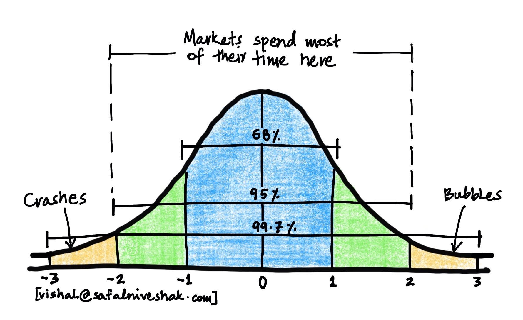 | However, this had an unintended consequence. In eleventh, my parents extrapolated my performance from tenth and drew a pattern in their minds that would move me within three standard deviations (among the top 2.5% students, which essentially meant first in class). They ignored the fact that my tenth performance was a tail event given the rest of my performances at school, and they should not have predicted the future based on one such event that had a rare chance of re-occurrence. Well, to their dismay, I came back to one standard deviation in eleventh, thus failing their expectations. After that, they stopped expecting anything from me (which, in hindsight, was good). Now, the reason I share this story of my 'accomplishments' with you is because I was reminded of it while reading one of the Howard Marks' memos. One of the parts from the same reminded me of those days when my parents extrapolated my future performance by drawing patterns from the past, and failed because that past was a rare occurrence amidst my long list of average performances. This is, after all, what most of us investors do. Most of our investing lives is spent while the markets perform within two standard deviations of the normal, but we still use our learning from these times to extrapolate and predict how the markets will behave when they are beyond two standard deviations i.e., during bubbles and crashes. Now, we are not wrong in building our expectations using such past history, for that is where we spend most of our time, but that is what makes predicting such a difficult, almost impossible, task. Here is the part from Marks' memo I am referring to – …one of the great conundrums associated with investing … Since we know nothing about the future, we have no choice but to rely on extrapolation of past patterns. By "past patterns," we mean what has normally happened in the past and with what severity. And yet, there's no reason why (a) things can't happen that differ from those that happened in the past and (b) future events can't be worse than those of the past in terms of severity and thus consequences. While we look to the past for guidance as to the "worst case," there's no reason why future experience should be limited to that of the past. But without reliance on the past to inform us regarding the worst case, we can't know much about how to invest our capital or live our lives. Many years ago, my friend Ric Kayne pointed out that "95% of all financial history happens within two standard deviations of normal, and everything interesting happens outside of two standard deviations." Arguably, bubbles and crashes fall outside of two standard deviations, but they are the events that create and eliminate the greatest fortunes. We can't know much in advance about their nature or dimensions. Or about rare, exogenous events like pandemics. |