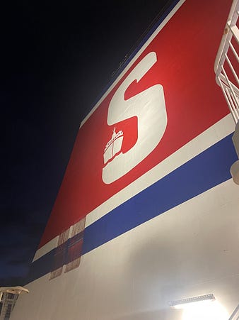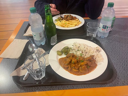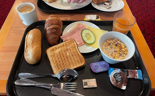 Thank you for signing up to dinner document by Rebecca May Johnson! If you’d like to support my work, become a paying subscriber. Hello! My name is Rebecca May Johnson, I am a writer and cook and this is my Substack. This week’s newsletter is about a trip on a ferry from the UK to the Netherlands and eating notes. Canteen on the Stena HollandicaAfter a five minute train journey from Harwich Town to Harwich International we arrive the ferry terminal at 9pm, the beginning of the window for checking in. We take a lift from the platform to a bridge over the tracks that leads into the terminal. The only other person in the large foyer area is a Dutch man with a bicycle who is trying to convince the woman at the desk to allow him to buy a ticket for this journey. She says he must wait for her colleague to see if there is space in thirty minutes. Thirty minutes? Thirty minutes. At the baggage security check point the man running things jokes to his colleague that he’s drinking gin from his large clear plastic water bottle and offers it to her; she says she doesn’t like gin. We are the only people going through the security for foot passengers. I have to take off my shoes as they set off the alarm. Unlike at an airport there are no restrictions on liquids such as shampoo etc in one’s luggage, and it is not necessary to take them out of the suitcase. Then we depart land by walking on to a glass-walled corridor suspended in the air between the terminal and the ferry, which allows us to note the large scale of the ferry, and the lorries and cars coming onboard below, and workers driving uncannily speedy luggage moving vehicles up and down a ramp. Onboard the Stena Hollandica for the first time – gleaming orange-beige wood effect veneer walls, gleaming chrome trim. Lots of staff are waiting to greet us and direct us to the lifts which take us to the floor where our cabin is.