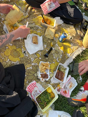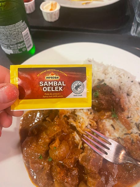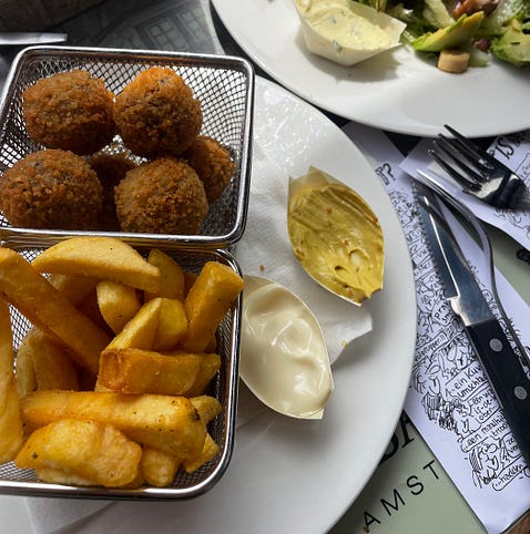 When we arrive at the cabin, we open the door and directly opposite is a large porthole with an embedded window seat looking onto the water. It is still light at 9.15pm in late June and S immediately lies down on the window seat and looks out at the water. He loves window seats and – in a slightly anxious but enthusiastic manner – likes to monitor what is happening on airplanes and boats when in transit. There is a comfortable double bed with a single bed above it which I fold away. There is a TV and quite a large toilet/shower room, which smells of drains. I peer into the shower drain and see water glinting through the metal grille. I wonder at how each cabin must have its own draining and heating and air con system. The room itself does not smell and is a good temperature, cool but not cold. We are among the first to arrive in the canteen dining room, which is two floors below our cabin. The space opens-up expansively and red quilted pleather seats with chrome legs arranged around tables stretch out over what seems like acres of red pattered carpet and chrome pillars. The chrome and pleather is retro space-age glamorous. There are also two bars with beer on tap on opposite sides of the room. We begin to look at the canteen menu, then, at the suggestion of the host, we walk over to look at the à la cart restaurant, which is screened off, and has a menu for people to look at the entrance on a lectern-like stand at its entrance. I consider seabass, I consider risotto, I consider steak. But there is a minimum order of two courses, and it feels expensive at the beginning of the trip. Plus, all of the sea-view tables have ‘reserved’ signs, the atmosphere is a little too hushed, and the seating area is isolated from the people-watching fun of the main dining area. Moreover, I love canteens. When we return to the canteen a queue has formed. We each take a tray. The trays are plastic and dark brown with an almost adhesive rubberish surface added on – for rough seas, I suppose. I try not to think of that. The queue inches forward and we reach the refrigerated drinks cabinet and take Heineken beers and sparkling water. People ahead of us are ordering pizzas cooked in a series of mini pizza ovens behind the counter. They look like convincingly rendered versions of contemporary sourdough-type pizzas. Fish and chips with mushy peas which are attractively presented on a little metal tray with a piece of decorative greaseproof paper are also popular. Personally, I consider the fish, the ricotta and spinach cannelloni, and IKEA-alike meatballs with lingonberry jam and gravy and mashed potato, but settle on beef stroganoff with rice. I think that unlike fried fish which may become soggy from waiting to be served stroganoff might improve with a long resting time – a dish suited to a canteen. I decide against the meatballs as I intend a visit to IKEA soonish. The man serving me dishes out a generous portion of stroganoff and rice and then turns to the garnishing section, where he picks up parsley and sprinkles it over, and adds a handful of sliced gherkins to the plate. S has the same as me but with chips instead of rice: always a hard decision to make. We sit on a table one back from the sea view seats, which have been claimed. The parsley is aromatic and truly fresh cut, the gherkins crisp and sharp, and the meat is soft, with a richly flavoured sauce. I add a sachet of sambal oelek which is provided alongside ketchup and mayonnaise at the cutlery station for a bit more heat and seasoning. Around us people of all ages eat pizza, drink beer and wine, hunch round tables to chat, and take a look around at the room. There are various announcements over the tannoy about the truckers’ canteen, which is located elsewhere on the ship and to which other passengers are not invited. After a few rounds of a card game for which I have to look up the rules – ‘Golf – we go outside and climb several sets of stairs to go to the highest viewing deck. We are high up, alongside the huge red chimney emblazoned with an ‘S’, lit by floodlights. The ship sets off at 11pm and moves out of the Stour River to the estuary where the Stour joins with the Orwell River and flows out to sea. We glide past Felixstowe docks and get a close view of lorries driving up and down the quay loading containers on and off ships and then we reach the end of land and set out to sea on a path lit by red and green channel buoys that wink in the darkness. Back in the cabin S sits on the window seat and looks out at seagulls diving into the ship’s wake, hunting for fish. Eating Notes The day time before we catch the evening ferry: wonderfully crumbly scones with cream and jam at Felixstowe Book Festival made by the mother of novelist Ruth Dugdall who chaired the talk about my book. Ruth’s mother asked a question: do I listen to music while cooking? I said yes and asked her if she did and what she listened to and she said: ballads by Alison Moyet, Barbara Streisand, and Rod Stewart. Breakfast on the ferry. I didn’t feel like an egg so had some jam and cheese and chocolate spread and Dutch chocolate sprinkles and a mix of grapefruit and orange juice. Bitterballen in in the centre of Amsterdam: breadcrumbed balls with small pieces of meat in a bechamel. Dipping in the mustard. Very hot, very nice! A sparkling blackcurrant Fanta in a glass bottle at a cafe. I loved this flavour. Indonesian takeaway picnic in the park in Amsterdam with Hannah and Tom on Hannah’s beautiful blanket. It was delicious. Cassava chips with peanut sauce, lamb curry and a hard boiled egg and green beans with roti, chicken skewers with peanut sauce and pickled cucumber salad, stuffed rice with a sharp hot sauce. News and EventsIn the last fortnight two long form reviews of my book Small Fires were published. Being read in this attentive, sustained way is the greatest honour. Marion Bull for n+1 Siobhan Phillips for LA Review of Books On 19 July at 6p
