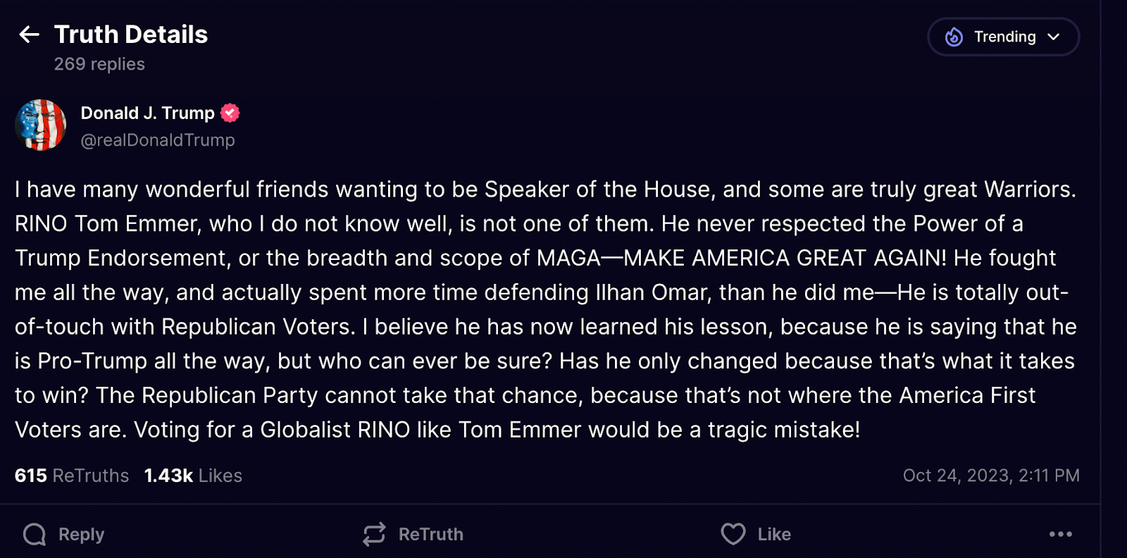 Given the GOP fealty to Trump, Emmer’s ascendancy is likely to prove short-lived, and the other eight contenders may be called back from the wings. This would certainly seem to bode well for Mike Johnson, whom Emmer beat out in the last round of balloting—but things really could tip in any direction at this point. Even before today’s rounds of secret balloting, the knives were out for Emmer. “Allies” of Trump circulated a dossier against Emmer that includes an old DUI arrest. But much of what this dossier, first reported by the Messenger, says about Emmer is boilerplate; DUIs and similar arrests are hardly uncommon among the denizens of Capitol Hill. With just a few seconds googling you can dig up details about a DUI arrest of Matt Gaetz, several arrests and court no-shows by Lauren Boebert, and a dropped marijuana distribution charge for Donalds, another of the top candidates for the gavel. These all occurred prior to their careers in Congress. The same is true of Emmer’s DUIs: They were 1981 and 1991, when he was 20 and 30 respectively, nearly a quarter century before entered Congress. People fall down all the time. It’s admirable when they manage to pick themselves back up again. As long as the situation has been rectified and properly addressed—legally, morally, personally—most old problems shouldn’t be disqualifying for elected office. But you know what should be disqualifying behavior? A fairly recent desire to overthrow a legitimate election. With the exceptions of Emmer and Scott, all nine of the men who last night were vying for the speakership voted against the certification of the 2020 presidential election. And even Emmer and Scott, while they didn’t abandon the will of the voters in the hours after the January 6th attack, did sign on to an amicus brief supporting Texas’s lawsuit attempting to throw out legitimate votes in multiple swing states, something that even the National Review editorial board called “a grotesque violation of federalism and our constitutional scheme, not to mention democracy.” All of the speaker candidates except for Donalds and Sessions signed the amicus brief endorsing the lawsuit. Why didn’t those two sign it? Because they weren’t in Congress at the tail end of 2020.¹ But they both made sure to oppose certification in their first week on the job. In Washington, nobody’s hands are clean. Among the nine contenders standing on Monday night, there are plenty of things that could be significantly more damaging than a DUI in the eyes of their fellow Republicans—though maybe not the rest of the country. Consider the following things that Republicans love to hate: