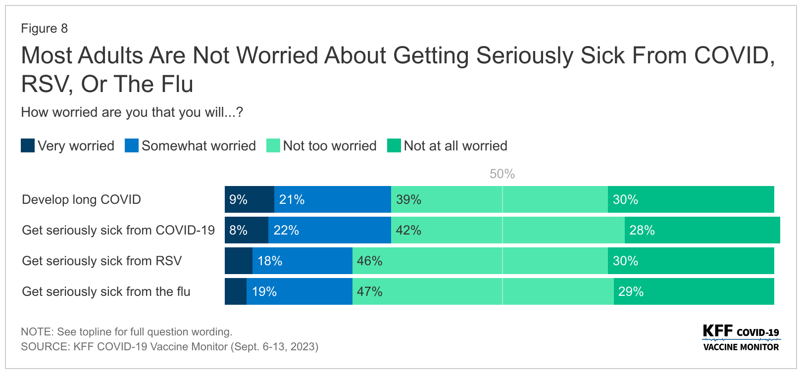Americans aren't as worried about Covid-19 now. About two-thirds of US adults said they were not concerned about getting seriously ill from Covid-19 in a September survey from the KFF health policy think tank. That figure was about the same for the flu and RSV, suggesting Americans have come to view the novel coronavirus as a similar health risk to other cold-weather illnesses that have been circulating for a long time.
