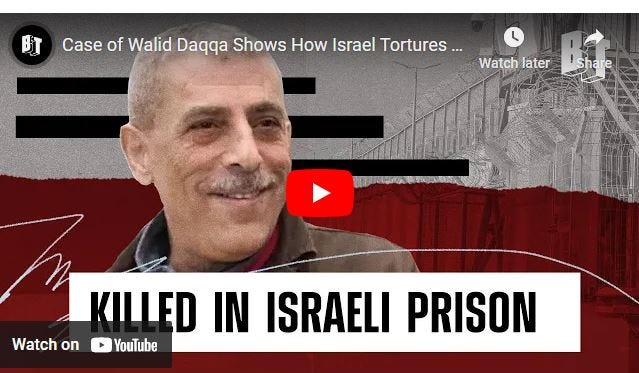 Case of Walid Daqqa Shows How Israel Tortures Thousands of Palestinian Political PrisonersRania Khalek- "Israel wants to practice these torture methods to break our spirits, to dissuade us from resisting ... this is something Walid Daqqa had consistently warned us about." - @basilafarrajWalid Daqqa, a prominent Palestinian revolutionary organizer and thinker, and one of the longest-serving Palestinian political prisoners, died in an Israeli jail after spending 38 years imprisoned by the Israeli occupation. Diagnosed with cancer in 2022, Israel killed Daqqa through medical neglect, refusing to provide him with available medical treatment. ….. TheAltWorld’s Newsletter is free today. But if you enjoyed this post, you can tell TheAltWorld’s Newsletter that their writing is valuable by pledging a future subscription. You won't be charged unless they enable payments. |