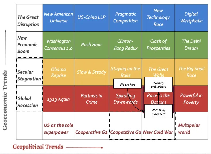 The article also hints at some trends that might spoil the party for India: the global economic slowdown, rising protectionism, and the climate crisis, to name a few. Long-time readers will recall that we had developed scenarios to understand such trends and their impact on India in the book India's Marathon: Reshaping the Post-Pandemic World Order.