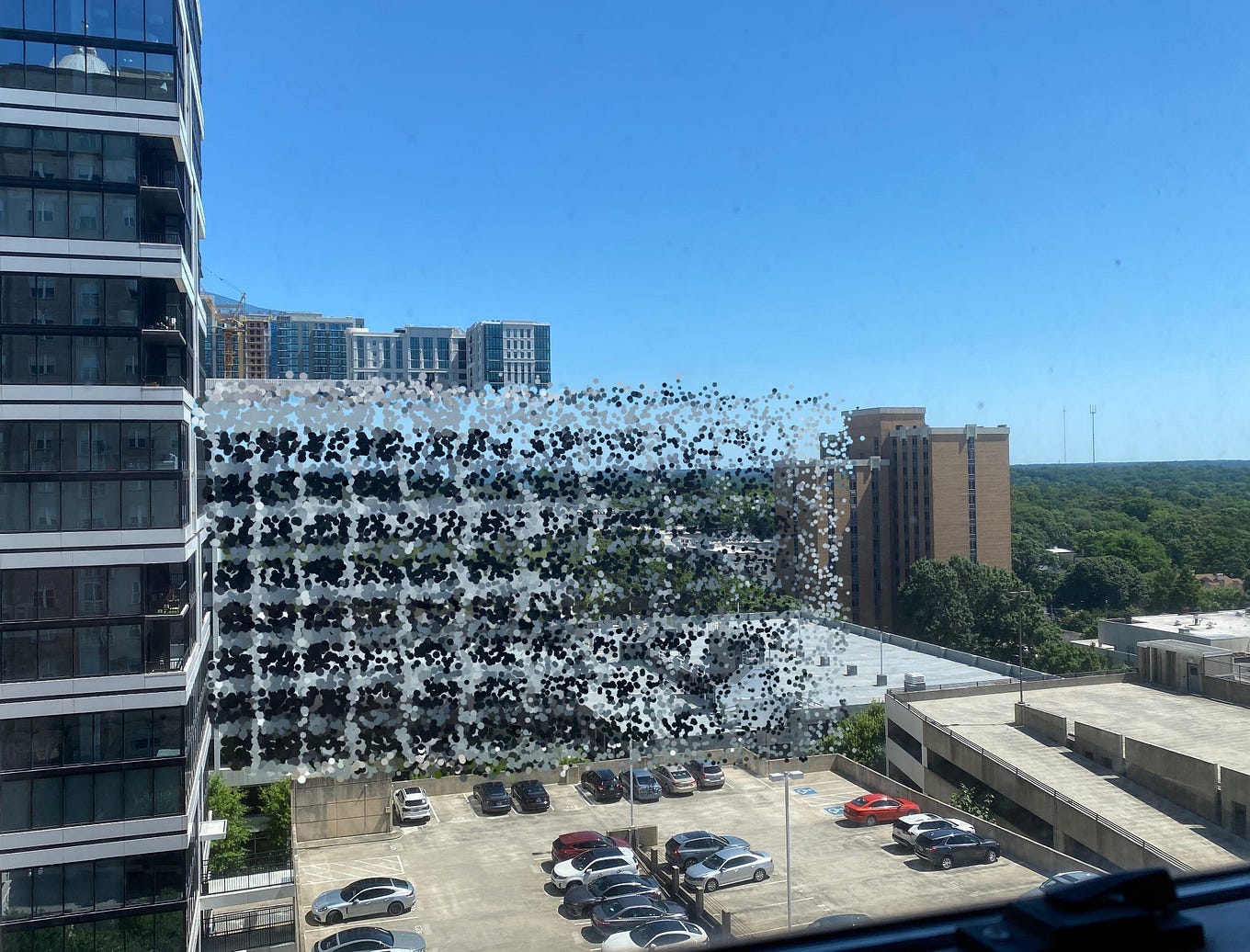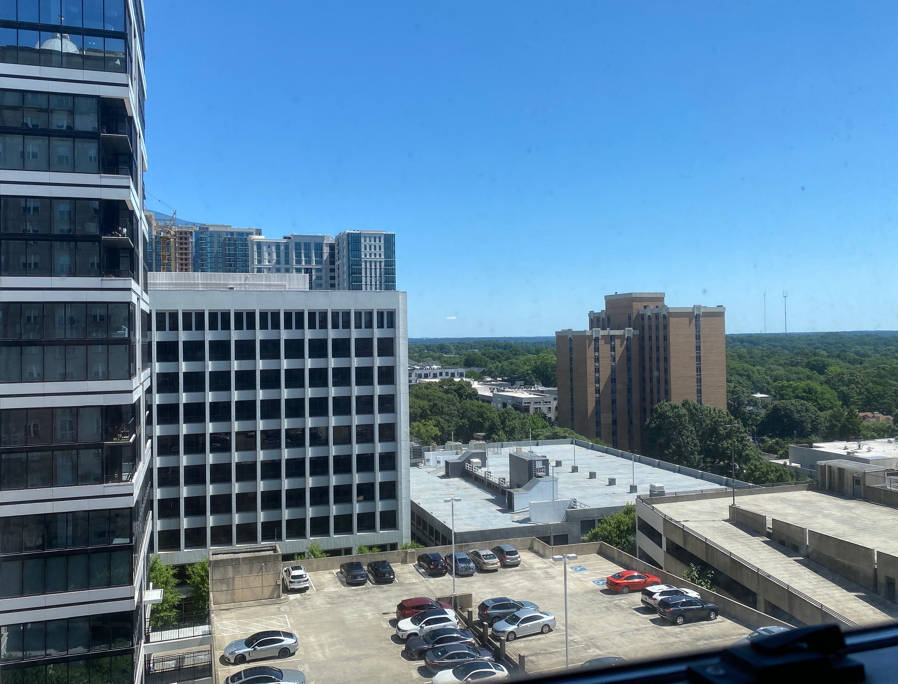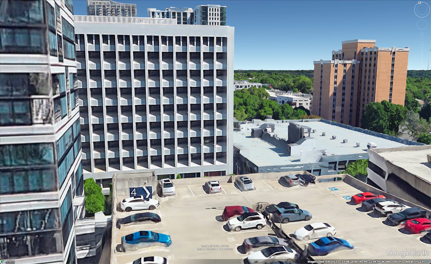 We are in a booming city in the Southern US. It feels slightly hilly, so maybe Austin is on the docket again? The arrangement of three rooftop parking lots/garages in the foreground should be a good marker to look for, and none turned up in Austin, San Antonio, or Dallas, but there were some tantalizingly close combinations of rooftop lots, so it felt like I was on the right path. Houston is too flat.