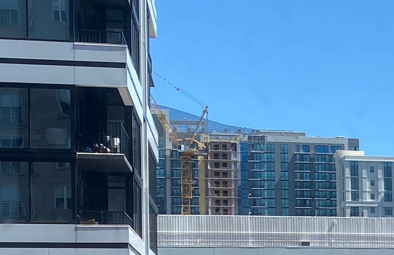 It took a while to figure out how to approach this one. The fact that it’s a large, very flat city in the US, with a lot of new construction, was clear but didn’t particularly help. I was waylaid for a moment wondering what to think of a parking garage that puts its ADA parking spaces so far from an entrance. Not to mention, how often do you see two Porsche Panameras parked on the roof of a parking garage? (They’re the cars in spaces 424 and 436. A new one will run you more than $100K, and though neither one of these is new, the presence of even one tells me the attached building probably has some pricey condos in it).