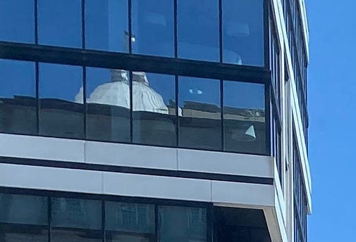 But it’s not a capitol building, as the ski-nerd correctly notes: “You can see the hotel’s pointed white dome in the reflection of the nearby tower”: