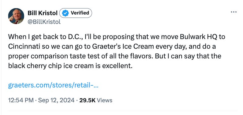🚨OVERTIME🚨Greetings from the Queen City and Happy Thursday! The boss is in town to give the 1835 Lecture at the great Mercantile Library, so I’m working from an historic art-deco train station, one of America’s last great ones. It’s also the city’s museum center, so while “The Merc” undergoes renovations, the lecture is here instead. Bill reports that Graeter's Black Cherry Chocolate Chip Ice Cream is excellent, and indeed, Graeter’s ice cream, no matter the flavor, is! We Ohioans are very proud of our #brands. We might even move the whole operation here, if Bill (and I) get our way. Soup’s On… When TWS closed, one of our final issue’s fine essays was Alice B. Lloyd’s “Last Lines.” Locally, Brandon Wuske was Cincinnati Magazine’s food critic. At 40, he was newly engaged, his fiancee had just secured a visa to come to the U.S. A beloved local librarian, he got a nasty surprise: a stomach cancer diagnosis. A few months later, he died. His last column on chicken noodle soup, and why he never appreciated it until, well, just read the whole thing. I don’t want to spoil it for you. The $10 Million J6er… We’re learning that RFK’s dumpster fire candidacy paid $10 million to a consultant inside the restricted area on January 6. Nice work if you can get it. (The Intercept) Yesterday’s 9/11 anniversary offers a stark reminder… about Trump’s fitness for office (Anthony Fischer, MSNBC) On Conversations with Bill Kristol… please welcome, the co-host of CNN's Crossfire, famed political consultant, the raging Cajun, Mr. James Carville. Trump’s Slow-Burn Authoritarianism… “You’ve read about the scary horrors of a Trump second term. But a legal war of attrition that harasses MAGA’s enemies and transforms government info into propaganda could prove more insidious and harder to mobilize against.” Greg Sargent, The New Republic. All Over But The Whining? Matt Labash writes: “Trump loses a debate, and is already constantly complaining.” A Christian Case… Against Donald Trump. A book by Bulwark+ member Patrick Kahnke that’s worth checking out. Patrick is “a writer and podcaster at Culture, Faith, and Politics. He was an evangelical pastor for 20 years. He was active in the pro-life movement and a life-long Republican until Donald Trump.” Tech support questions? Email members@thebulwark.com. Questions for me? Respond to this message. —30— Editorial photos provided by Getty Images. For full credits, please consult the article. You’re a free subscriber to Bulwark+. For unfettered access to all our newsletters and ad-free and member-only podcasts, become a paying subscriber. Did you know? You can update your newsletter preferences as often as you like. To update the list of newsletter or alerts you received from The Bulwark, click here. |