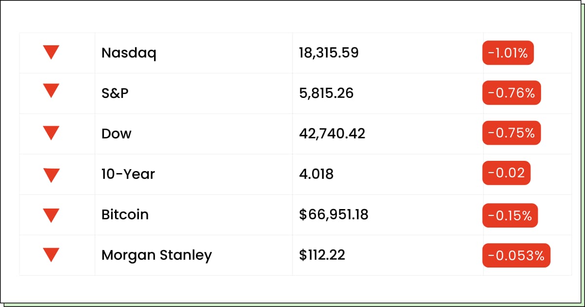 | Previous Close 📈 | | Stocks slipped on Tuesday, with the Dow and S&P 500 both falling 0.75% and 0.76%, respectively, after recently hitting record highs. The Nasdaq Composite dropped 1.01%, driven by declines in tech stocks, particularly semiconductors. | Futures | U.S. stock futures are little changed today. S&P 500 futures are flat, while Nasdaq 100 futures have ticked up 0.2%, and Dow futures are down by 24 points. |