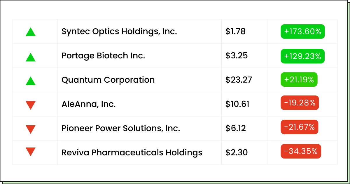 | | | | Movers and Shakers | | Portage Biotech Inc. [PRTG] - Last Close: $3.25 | Portage Biotech Inc. is trending up during premarket trade due to the announcement of its strategic partnership with Immunova. | The clinical-stage immuno-oncology company has signed a letter of intent with Immunova to negotiate the sale of its subsidiary, iOx Therapeutics, Ltd. | iOx focuses on developing liposomal iNKT agonists, with its lead candidate, PORT-2, showing promising preliminary clinical activity. | This move aligns with Portage's strategy to unlock asset value and accelerate clinical development. | Investors are responding positively, driving PRTG shares up +129% in premarket trading. | My Take: With a market cap under $5M and a high volatility index, it would be best to watch out for volume confirmation before entering into this stock. |