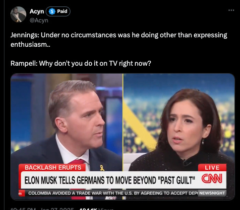 Danielle Hegseth was clearly unfamiliar with Tillis’s game. After all, how many times have we seen a Republican senator clearly know what the responsible vote was, hint at doing the responsible thing—and then vote the other way? WHO KNEW THEY HAD ENEMIES?: Bill wrote yesterday about co-president Elon Musk’s speech to the Alternative für Deutschland, in which the tech mogul talked about the need to forget Germany’s Nazi past just days after he failed to defend himself against accusations of making a Nazi salute. Turns out your Morning Shooters weren’t the only ones who didn’t take kindly to Musk’s fascist apologia. Per Politico: