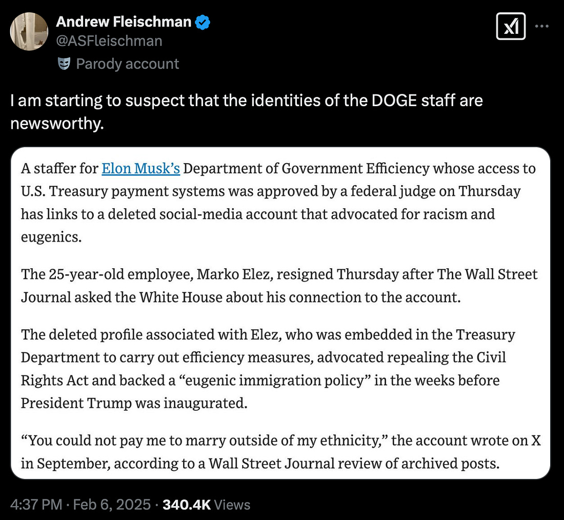 Trump wants to cut taxes, clearly. But he also wants to keep spending like Louis XIV, who supposedly dismissed his profligacy with the phrase, “Après moi, le déluge.” Honestly, we’d be lucky to get to the “après” part at this point. WHAT’S THE HARM IN HUMORING HIM?: Trump’s ridiculous plan to depopulate Gaza and turn it into some kind of real-estate development was met with immediate rejection from the rulers of Saudi Arabia and Jordan, Trump’s “favorite dictator,” Abdel Fattah el-Sisi of Egypt, and even, more subtly, Trump’s own administration and staff. But Israeli Prime Minister Benjamin Netanyahu, desperate to hold onto power to avoid corruption charges, mired in a war for which he has no apparent theory of victory, and dependent on his government’s right-wing factions for political survival, has endorsed Trump’s plan—kind of. CNN reports: