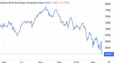 On the first day of trading after the extended post-Ramadan break, Indonesia's IDX stock exchange was forced to close five minutes after it opened today (April 8), falling by 9.2 percent in response to deep concerns over US tariffs and deeper structural issues including a falling rupiah, erratic presidential policies, budgetary overspending, rising state-owned enterprise debt and the growing presence of the military in government. The Jakarta Stock Exchange (IDX) reopened after 30 minutes, recouping some of its losses but closing down by 546 points, or 8.5 percent, at 3 pm, to 6008.5. But the prognosis is for continuing market upheaval after having fallen by 22 percent, from a high of 7905 last September 19. The rupiah has fallen by more than 10 percent from its September 24 high of 15,130 to hit Rp17,261 to the dollar, requiring Bank Indonesia on April 7 to intervene to stabilize the currency’s value amid disruptions in global financial markets. The US tariff hikes on April 2 and China’s retaliatory tariffs on April 4 have triggered capital outflows and weakened the currency of emerging markets, not just Indonesia’s, but Jakarta was already in the midst of a tailspin when the tariffs were announced. . US President Donald Trump imposed a 32 percent tariff on Indonesian exports to the US, expected to go into effect on April 9, due to a trade surplus in Indonesia’s favor of US$17.9 billion, on US$28.1 billion in joint trade, primarily in footwear, clothing, machinery, and electrical equipment. The palace in Jakarta said it wouldn’t retaliate, announcing it would instead pursue negotiations with the US Trade Representative and other agencies. Coordinating Minister for Economic Affairs Airlangga Hartarto said the decision to not retaliate was made with a view to protecting long-term bilateral trade relationships. "The approach was taken to safeguard the investment climate and maintain national economic stability," Airlangga said in a written statement on April 6. He added that President Prabowo Subianto had instructed the government to issue an official response to Washington DC, and prepare a trade delegation for further talks. The United States ranks as Indonesia's second-largest trading partner after China, with 11.2 percent of exports by value going to the US. Indonesian imports from the United States were US$11.34 billion, although that figure doesn’t represent intangibles the US records on its services account including non-merchandise revenues of Google, Microsoft, Apple, Meta, and lesser players, not to mention royalties generated by the likes of McDonald’s, Coca-Cola and other globalized US brands. It’s uncertain what action Indonesia could take in the face of uncertainty over the Trump-caused upheaval of the global trading regime. Governments all over the planet face plummeting markets in the midst of the chaos, scores of them rushing delegations to Washington to plead for relief. Indonesian rupiah to US dollar “The tariffs can trigger a recession for the Indonesian economy in the fourth quarter of 2025," Bhima Yudhistira, Executive Director at the Center of Economic and Law Studies, told local media on April 3. The economy had been projected to grow by around 5 percent this year, but given growing uncertainty, it’s unsure whether that target is attainable. Hendra Sinadia, Executive Director of the Indonesia Mining Association, told reporters on April 6 that demand for Indonesian natural resources is expected to decline if the global industrial sector contracts as a result of the US tariffs. But Jakarta has problems of its own making, many of them generated by Prabowo. The benchmark IDX Composite Index plummeted so sharply on March 18 that officials also halted trading for 30 minutes, the market’s worst performance since the onset of the Covid-19 pandemic. A combination of domestic issues has eroded investor confidence including a series of government policies implemented without adequate risk mitigation. Analysts are urging the government to take immediate recovery measures to prevent a deeper collapse. The state budget deficit as of February reached Rp31.2 trillion, with debt interest repayments totaling Rp79.3 trillion in the first two months. The rising debt burden could hinder productive government spending, preventing the economy from receiving optimal stimulus. Since taking office last October 1, Prabowo has launched a universal school lunch program whose costs are projected to reach Rp420 trillion (US$25.90 billion), more than 10 percent of the entire US$226 billion equivalent fiscal budget by the end of the year. He is also backing a massive US$60 billion seawall to protect Jakarta from sinking, and has continued downstreaming of resource-based industries and other programs. Former President Joko Widodo’s stalled Kalimantan government capital, Nusantara, remains an expensive project and its completion feels increasingly uncertain. Estimates from 2023 suggest that Indonesia's six biggest construction SOEs collectively faced debt of over Rp1,000 trillion (US$62.8 billion), an average of US$11.3 billion per company, which is likely to severely limit their ability to invest in new projects and technology. The debt is largely driven by Jokowi’s use of SOE borrowing to fund numerous expensive infrastructure projects, including Nusantara, during his decade in office. Prabowo has raised other concerns, however, including, as Asia Sentinel reported on February 28, the steady blurring of the lines between an elected civilian government and the military, the TNI (Tentera Nasional Indonesia). In March, Indonesia's parliament passed revisions to the country's military law, allocating more civilian posts for active military officers as students and activists protested against the legislation, saying it could take the country back to the draconian 'New Order' era of former strongman President Suharto, when military officers dominated civilian affairs. Prabowo, a