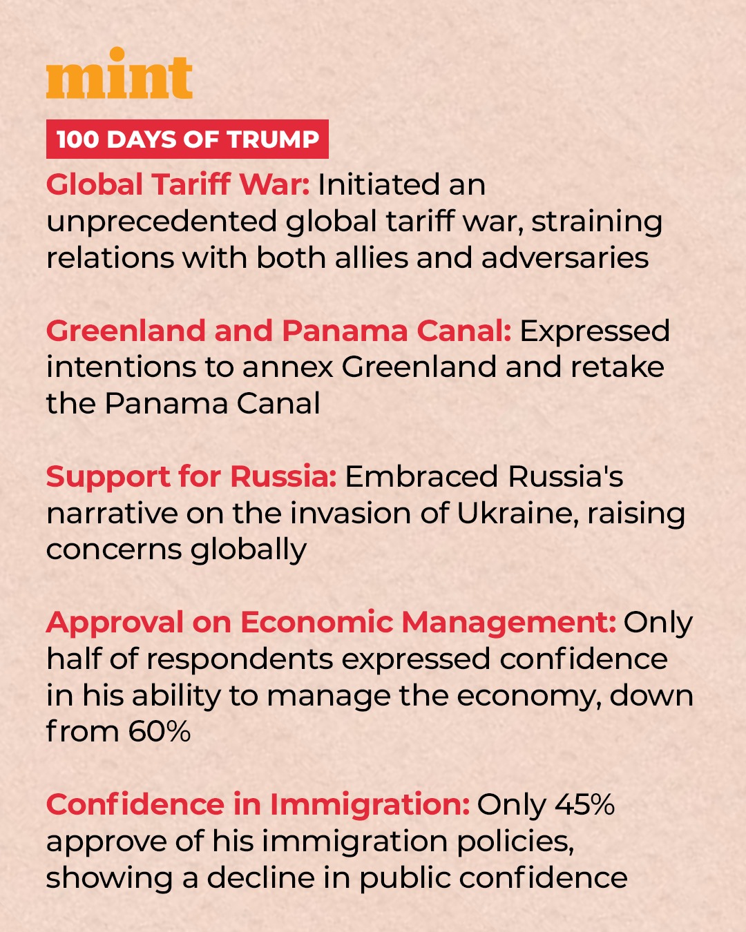 Dear reader, By the time you read this, Donald Trump would have completed 100 days as the US President. This is, of course, not his first stint in the big seat — but most certainly, this is the more remarkable one. In fact, Trump's 100 days as the most powerful person in the world might be more consequential than any other leader in recent history. When he took oath on 20 January, Trump had two clear focus areas: global trade and domestic deregulation. And he's overhauled all of it. | Image by Vikas Singh Bisht. | Instead of your regular edition of Top of the Morning , we're bringing you a special edition that revolves around Donald Trump's century in the White House. Strap in. He brought global leaders to their knees as the protector of the free economy by suddenly deciding to impose tariffs on every country (barring Russia!) After an initial threat, Trump decided to pause the imposition for 90 days, giving his counterparts exactly three months to acquiesce or bear the brunt. Much like most other countries, India too got into a huddle with the US to thrash out a trade deal. Jaishankar, India's external affairs minister, was present at Trump's inauguration as the POTUS. The Vice President, J.D. Vance, was in India just last week — although that trip was said to be more culturally significant, as opposed to diplomatic. | Domestically, Trump has killed "big government" by introducing DOGE, or the Department of Government Efficiency. Hundreds of thousands of layoffs ensued, followed by a cut in federal funding. If you were dependent on the US government for curing cancer or housing old folks, find an alternative source: Trump was cutting you off. Even big names like Harvard and Columbia Universities were not spared by Trump. Elon Musk is having a turbulent time as the head of DOGE, stemming from his experience in decimating Twitter's workforce. Musk continues to wield significant influence over Trump and his decision-making. PM Narendra Modi's official visit to the White House involved him playing with Musk's kids. While minimising the government's headcount, Trump also wants to maximise his country's resources. He has spoken often about annexing Greenland and Canada, often referring to the latter as the "51st state". | What's next? While the past is usually history, Trump's biggest achievement has probably been to play with time. His speeches, social media posts, and even executive orders seem extremely fluid. They are ready to be rolled out and taken back at a moment's notice. Trade deals will headline the next few months. As the 90-day deadline rolls closer, more countries will be eager to strike a deal with the US. Trump says he wants to "reorder global trade", but the US is already feeling uneasy about his threats. The next big item on the POTUS's agenda will be to end the Russia-Ukraine war. On multiple counts, Trump has shown that he is tired of this war and its global effects. He is likely to push the entirety of his foreign affairs' team to end the war, even if the terms look hasty. For now, Trump will kick off the near future with international trips. He is slated to visit Saudi Arabia, Qatar, and the UAE in May. Trips to the UK and Italy beckon later in the year. Perhaps a trip to India might be on the cards, too, but no official confirmation is provided yet. | Best, Shashwat Mohanty Editor, Newsletters and Audiences HT-Mint | Edited by Alokesh Bhattacharyya. Feel free to send any feedback by replying to this mail, or writing in to shashwat.mohanty@htdigital.in. | | | |