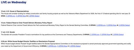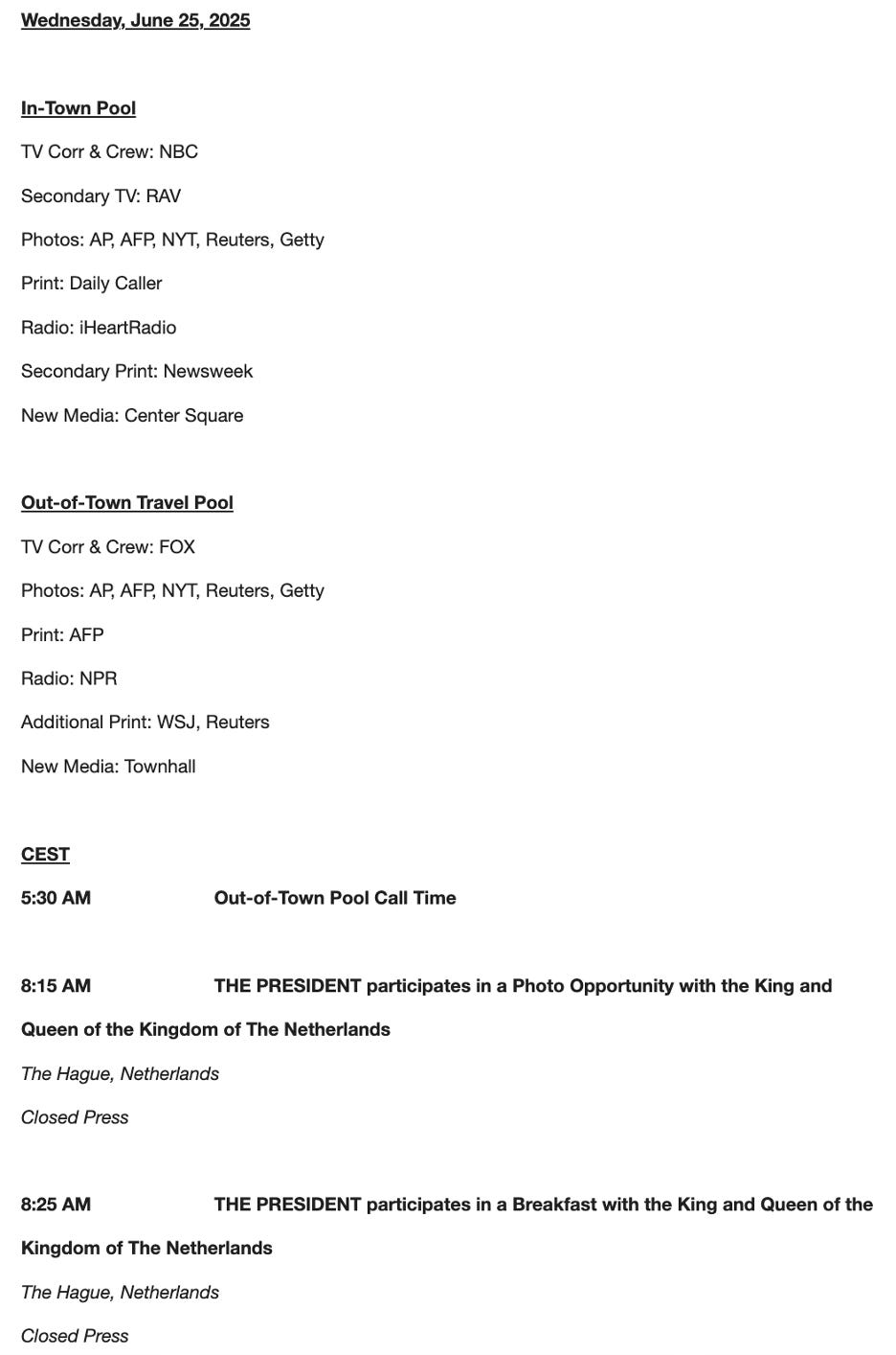 YouTube: DAYBOOK, all Eastern Time unless otherwise notedDONALD TRUMPJD VANCENo known public events at this writing. CABINET2:30pm: OMB Director Russ Vought testifies at an Appropriations committee hearing on the White House’s recessions package. Treasury Secretary Scott Bessent meets with National Association of Manufacturers President and CEO Jay Timmons and representatives of manufacturing companies across the US to talk about the GOP’s tax-and-spending bill. DHS Secretary Kristi Noem heads to El Salvador, where she will tour the Terrorist Confinement Center CECOT, and meet with President Nayib Bukele. CONGRESS9:00am: Republicans and Democrats hold their separate weekly conference meetings. 9:00am: Rep. Ro Khanna, Rep. Greg Casar, and other members of the Congressional Progressive Caucus hold a press conference on Iran War Powers Resolution. 10:00am: Senate Minority Leader Chuck Schumer, Senator Amy Klobuchar, and Senator Maggie Hassan hold a briefing on the “grassroots opposition to the ‘Big Beautiful Bill.’ 10:00am: Senior Adviser Kari Lake appears before The House Foreign Affairs committee on the alleged shortcomings of the US Agency for Global Media. 10:15am: The Judiciary committee considers various nominations, including for Emil Bove to serve on the Third Circuit Court of Appeals. ECONOMY10:00am: New home sales report for May is due out. LEGALKilmar Abrego Garcia is expected to be released from jail in Tennessee and to be taken into immigration custody. C-SPANFrom the great Robin Newton: “The Morning Meeting” topics:* Mamdani election meaning. * What’s next for Iran? * Trump at NATO. * Reconciliation. * AOC versus Trump. * Pritzker ’26/‘28. You’re currently a free subscriber to Wide World of News. |