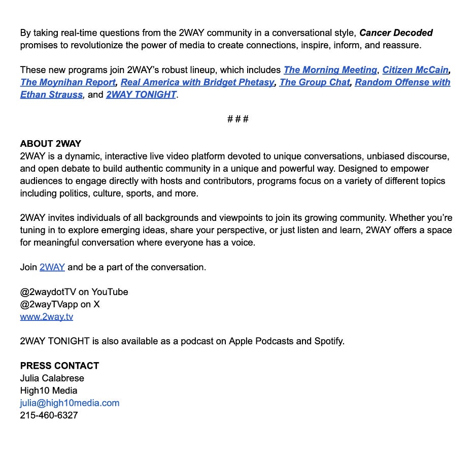 This free Wide World of News newsletter from Mark Halperin includes alerts for 2WAY programs, the daybook, political updates and analysis. If you would like to receive Mark Halperin's separate, daily premium Wide World of News Concierge Coverage newsletter, you can learn how to become a member here: https://www.walkingduck.com/mark When Political Unrest Turns ViolentLawmakers from both parties share concerns over political violence....WATCHToday on “The Morning Meeting," Sean, Dan, and I cover the latest on Israel-Iran, Bibi's Trump assassination claim, the Minnesota murders and more. COMING UP: “CANCER DECODED”Premiering Tuesday, June 17, 2025 at 7:30pm ET, “Cancer Decoded”—hosted by Dr. Patrick Soon-Shiong and me—aims to demystify cancer through open, compassionate dialogue. In the first episode, neuro-oncologist Dr. Simon Khagi joins us to discuss glioblastoma—an aggressive form of brain tumor—and the use of Dr. Soon-Shiong’s innovative Cancer BioShield immunotherapy platform in its treatment. See below for the full press release announcing “Cancer Decoded.” COMING UPOn today’s episode of “Citizen McCain,” Meghan is joined by Noah Rothman, senior writer at National Review, and comic Daniel-Ryan Spaulding LIVE at noon ET. To join LIVE and INTERACTIVE by Zoom, sign up here. To join LIVE by YouTube go here. ****Join me on “2WAY Tonight,” with Aaron Parnas and Kristin Davison LIVE at 6pm ET for our ongoing coverage of the Trump Administration, the Democrats, and all the latest political news. Watch LIVE and interactive on Zoom here. Watch LIVE and on-demand on YouTube here. **** You’re currently a free subscriber to Wide World of News. |