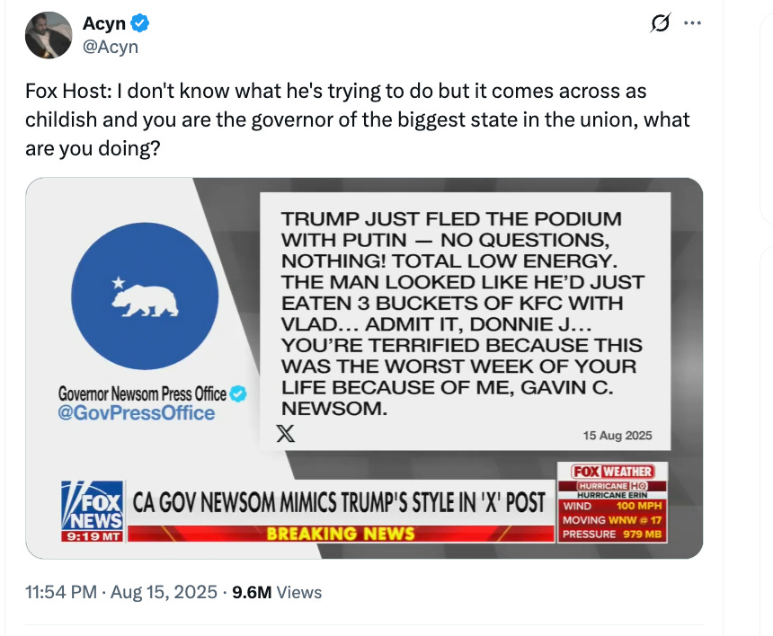 Trump Wants Cop Violence in Your FeedPlus: How much of the damage of the Alaska summit can Zelensky and the Europeans undo?Volodymyr Zelensky and a host of European leaders have been arriving in D.C. for a series of meetings with Donald Trump. Their mission: somehow impressing again on the president’s brain that Vladimir Putin is a flattering liar who shouldn’t be trusted. We’re waiting with bated breath to see how that goes. Happy Monday. Blood for the Blood Godby Andrew Egger By any objective measure, Donald Trump’s takeover of Washington, D.C. has gone off like a wet firework. Hundreds of masked federal agents aimlessly rove the capital downtown—the parts with the monuments, of course, not the parts with the crime. White House officials boast of the more than 300 arrests they’ve already made in the last two weeks—a more striking number before you remember that D.C. police already make an average of 68 arrests per day. It probably says something that the most notable headline that’s come out of the deployment was the arrest of the polo-and-shorts-clad lawyer who clocked an agent with a sub sandwich. (The FBI and U.S. Marshals dispatched a squad of agents in full tactical gear to nab him at his apartment, then posted the footage on X; U.S. Attorney Jeanine Pirro hit him with a felony charge.) As the city settles into its unsettled new status quo, it’s worth pondering: What’s Trump’s endgame here? I’m not talking about his goals in maximizing his own power—here, as ever, his goal in that department is simply “get as much as I can.” What I’m wondering is: What is the outcome for his D.C. takeover that Trump would be able to score as a success? The whole rollout is as clownish as it is alarming. Violent crime was already falling in the city. And it’s far from clear how simply pumping in agents from an alphabet soup of federal agencies, plus the National Guard—all of whom have their own procedures and chains of command—is supposed to be a boon to order rather than chaos. It’s easy to imagine the whole thing backfiring, with Trump’s troops failing to make a significant further dent in crime while trampling residents’ civil rights, sparking an even bigger backlash. (Be sure to read Jonathan Blanks’s article over on the homepage for a smart analysis of this mess.) But that analysis assumes that a further reduction in D.C. crime is actually what Trump wants. Here’s something Trump has grasped much more quickly than the rest of us: After a decade of feeding at the slop trough of our online political discourse, a critical mass of Americans are in such an advanced state of epistemic collapse that they have essentially given up on the idea that broad facts about the public—things like crime rates that can’t be felt or seen but can only be grasped as data—are knowable at all. The graphs, the numbers, the charts simply don’t matter. These voters either won’t ever see them in the first place, or, if they do, they’ll assume prima facie that the numbers are cooked. Many of these Americans don’t even trust their own experience—at least not first and foremost. The vast majority of people who care about violent crime as an issue haven’t suffered violent crime, and they’re not poring over the statistics. How do they get their sense of what’s what out there? Like everyone else does: by scrolling their apps and soaking in the algorithm. To win those people, Trump and his retinue realize, you need to win the algorithm. It’s not merely that the old methods of political persuasion don’t work. For all intents and purposes, the old methods don’t even register. They might as well not be happening at all. If a piece of political content, whether it be reasonable argument or pure uncut horseshit propaganda, doesn’t exceed a certain threshold of emotional stimulation, it essentially doesn’t exist. Why do Republicans think America in general—and its cities in particular—have a massive raging crime problem? Because their scroll surfaces them a parade of crime content—brawls, shopliftings, gangs of teens up to no good—and a barrage of right-wing influencers confirming for them that that content adds up to an epidemic. On this model, crime quietly going down in a given city literally doesn’t matter. No matter whether crime rates are screamingly high or admirably low, there will always be some crimes happening.¹ And in our camera-phone society, somebody might be taping when it happens. Trying to beat a drip-feed of highly alarming crime videos by brandishing statistics showing such crimes are in fact becoming more rare is like bringing a pool noodle to a gun fight. Trump has a different, more algorithm-oriented strategy. Somewhere deep in the brain stem, he senses that, in our incredibly stupid age, the difference between a peaceable law-and-order society and a disaster zone of lawless anarchy is that, under law and order, citizens’ streams of shortform videos of criminal content are punctuated by equally stimulating videos of cops. As he takes over D.C., Trump isn’t acting like a politician so much as a film producer. The goal isn’t quiet on the D.C. streets. It’s making something new for the content beast: video of clashes between masked cops and D.C. residents. Picking Up the Piecesby Cathy Young In the aftermath of the Alaska summit—and of the nauseating spectacle of Vladimir Putin being given a literal red-carpet welcome by Donald Trump—it looked like the worst might have been avoided: The meeting accomplished nothing, and Trump might even be annoyed at Putin over the lack of results. (Never mind Trump’s cordial, bantering response to Putin’s “Next time in Moscow” at the end.) Alas, Trump’s subsequent interviews made it clear that he had been snookered once more by the Kremlin autocrat. (Validating his narcissistic narratives—the stolen 2020 election, the idea that the war in Ukraine wouldn’t have start