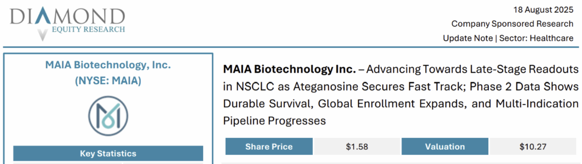MAIA Biotechnology, Inc. received FDA Fast Track designation for ateganosine (THIO) in treating non-small cell lung cancer (NSCLC), a $34Bn market with significant unmet need.