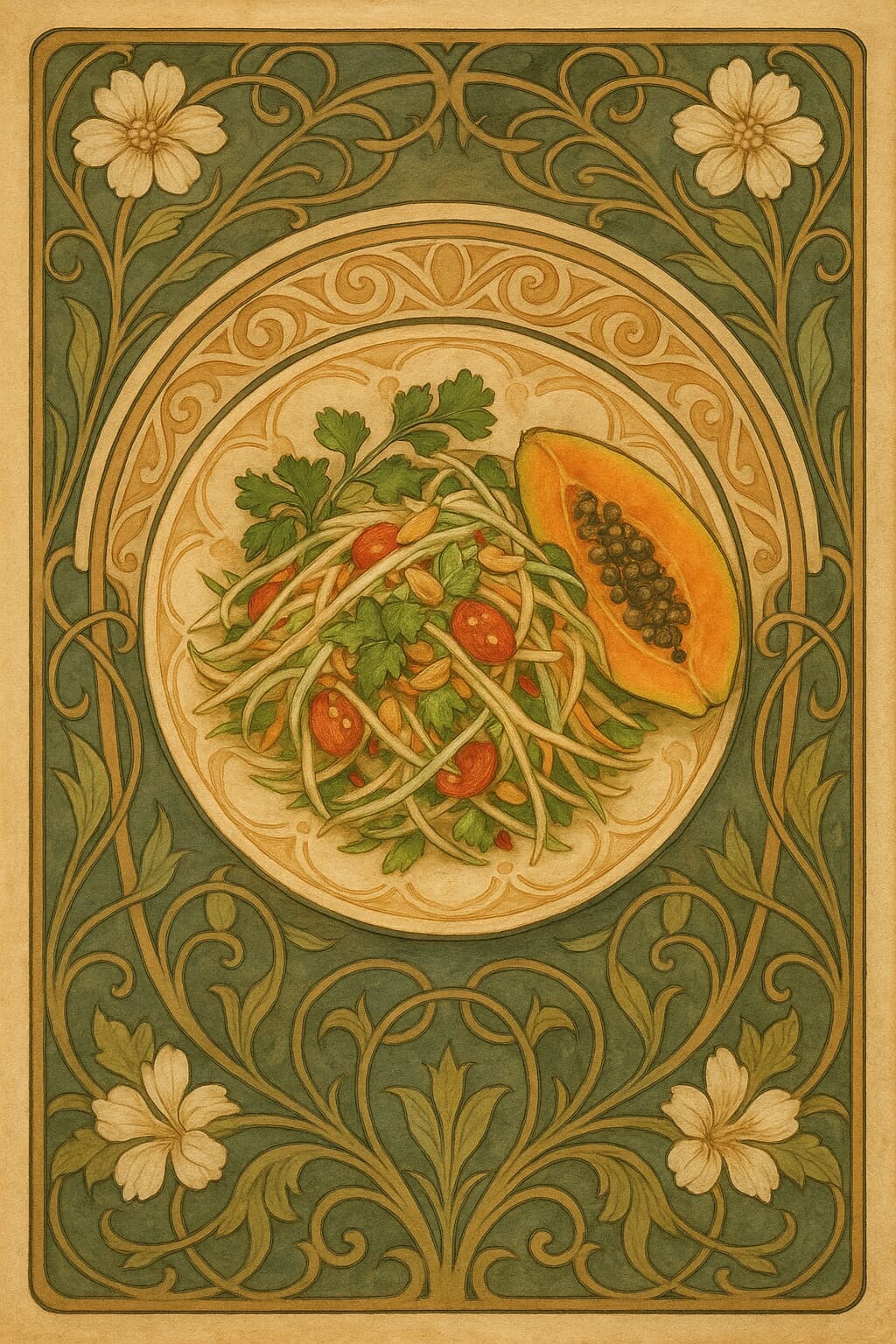 | | Spicy raw papaya salad with toasted nuts and a ginger-lime ghee dressing. Serves 2-3. |