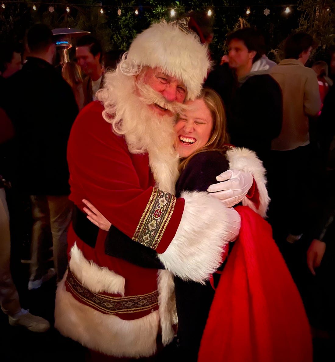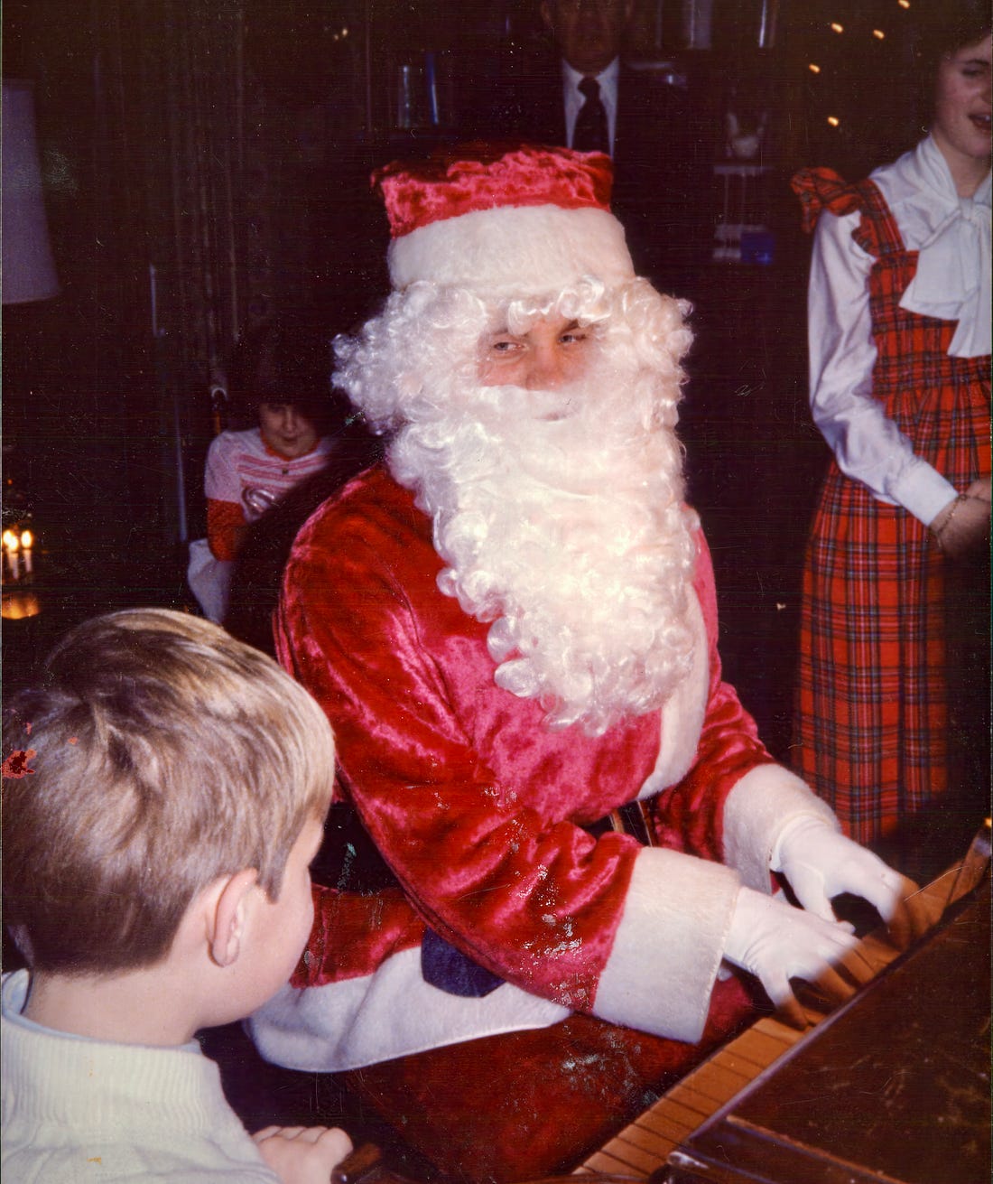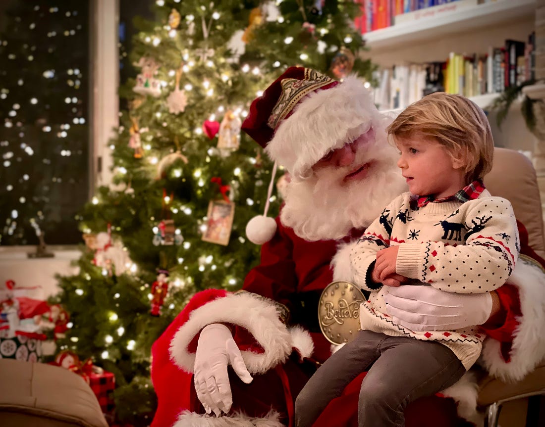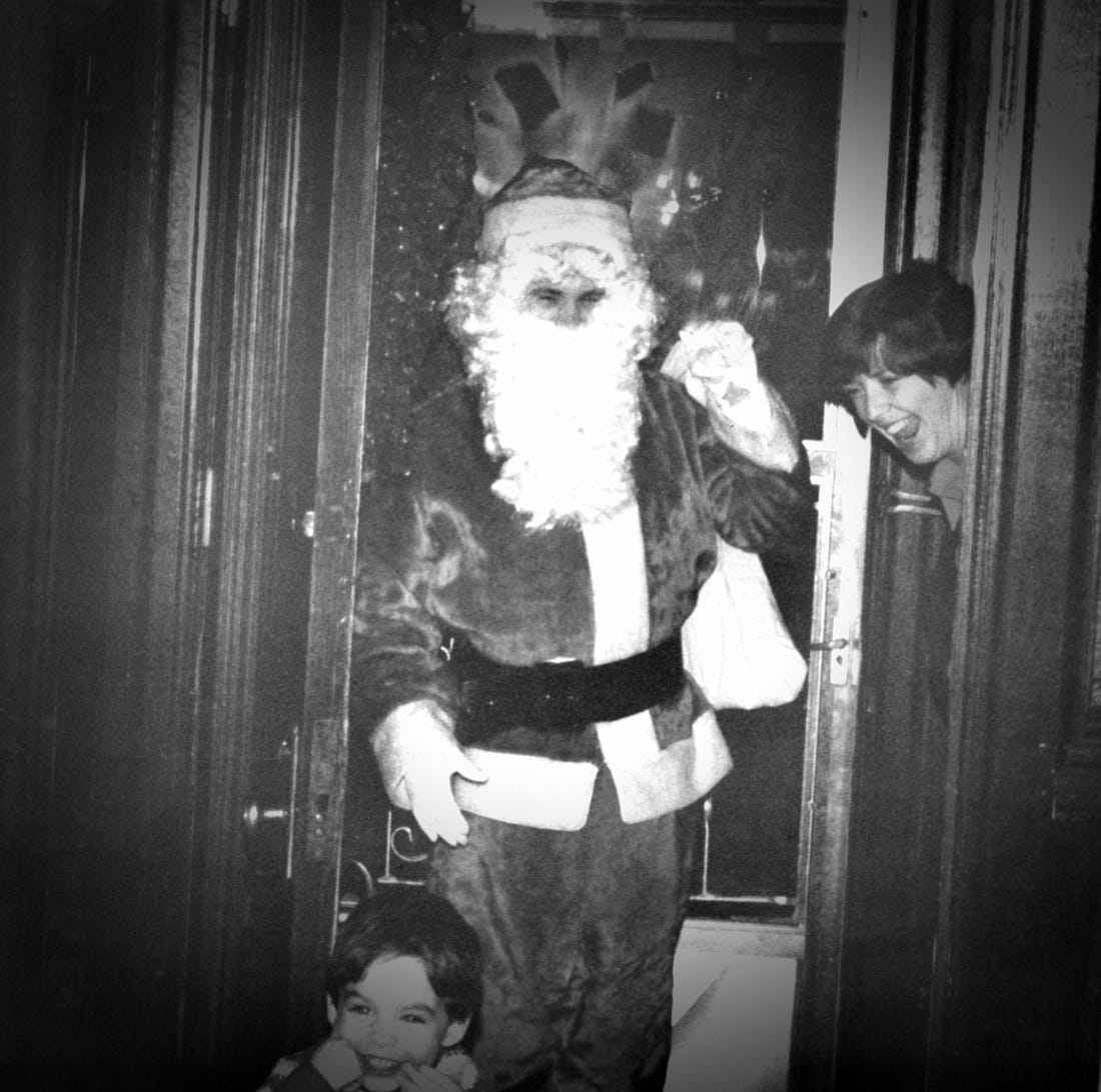 On those nights, I’d just walk down the family blocks with my Santa bag over my shoulder, looking in town windows for a big family Christmas party. I’d knock on the door, lower my voice about six octaves with a ‘Ho Ho Ho,’ and in I’d go. (Good luck trying that today.) As I’d walk in, I’d listen for parents calling out their kids’ names – and for the names of some of the happy aunts and uncles sipping their fourth Old-Fashioneds and Manhattans. I’d plug the names into a dozen pre-memorized lines from “Twas the Night Before Christmas.” In this half-English accent, I’d dazzle the kids and parents with Stephen Sondheim-esk quality lines like, “When what to my wondering eyes should appear, but fantastic Bobby—I’m so glad you’re here.” A simple magic trick. I’d throw all the adults in a tizzy trying to figure out who was missing and dressed as Santa. When I’d play “Santa Claus is Coming to Town” on their piano—that would really throw ‘em off. . I can’t possibly express the pure joy of sitting with kids and seeing the absolute wonder in their eyes—looking up at Santa. It doesn’t get better than that.