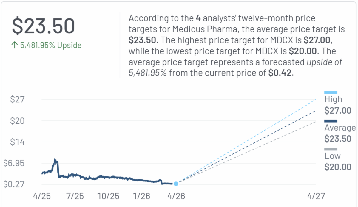 In fact, with an average target of $23.50, MDCX could have over 5,000% potential upside from its closing valuation on Tuesday the 17th.